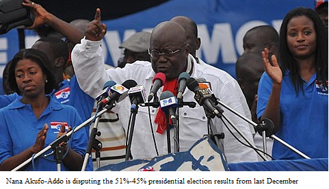 | From Leadership Newspaper (Nigeria), about the Ghanaian center-right politician’s case before Ghana’s Supreme Court: « Mr. Nana Akufo-Addo, Presidential candidate of Ghana’s New Patriotic Party (NPP), said he would accept the verdict of ongoing election petition matter before the country’s Supreme Court. Akufo-Addo stated this in his Accra residence on Friday when the King (Asantehene) of the Ashanti Kingdom, Otumfuo Osei Tutu II, visited him. ‘Our party has a very good record; the party is reputed to be peace-loving, if you