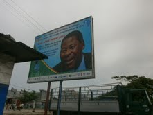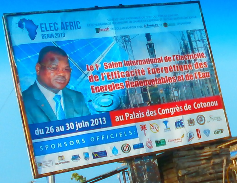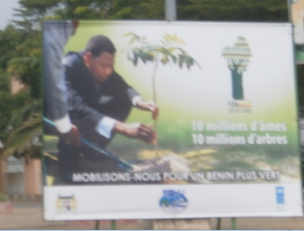 | La ville de Cotonou est devenue le salon d’exposition de Monsieur Yayi. Pour une raison ou une autre, souvent tiré par le cheveu, des affiches à sa gloire exhibant ses photos sont placardées dans les lieux stratégiques de la ville : Aéroport, Carrefours, Devanture des Marchés, Feux rouges, le long des artères principales, etc… Il s’agit d’un mode détourné de propagande pro hominem du pouvoir. A peine compréhensible lorsque le président patronne directement un événement comme le RAMU ou l’opération 10 Millions d’arbres, 10 Millions d’âmes. Mais plus douteux lorsqu’il s’agit des « 120 jours pour équiper les hôpitaux », « 120 jours pour lycées et collèges » ou ’du Salon international de l’électricité. Et même lorsque les événements qu’annoncent ces affiches sont dépassés depuis plusieurs mois, elles continuent de trôner fièrement dans la capitale. Pour rappeler à tout un chacun et surtout à ceux qui l’auraient oublié, que le Président du Pays s’appelle « Docteur Yayi Boni »
