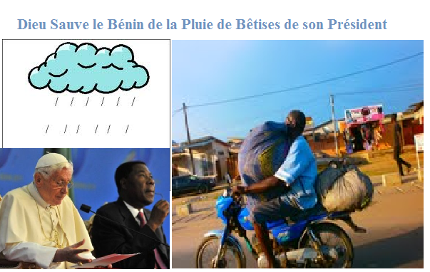 Un jour plus ou moins proche, lorsqu’un pays comme le Ghana aura réussi par ses efforts, son travail et son sérieux l’adhésion aux voies et moyens qui accroissent l’intelligence collective, au lieu de l’arriérer passionnément comme c’est le cas au Bénin, ce jour-là, des expériences lamentables comme celles qu’imposent à la société béninoise M. Yayi Boni et la tourbe infecte de ses acolytes seront bonnes à jeter à la poubelle de l’histoire. Et le Bénin n’aura pas le choix de suivre le bon exemple. Un Président soi-disant Docteur en économie, dans le but d’endormir le peuple sur sa propre médiocrité, en exploitant honteusement les croyances et les émotions religieuse de la multitude maintenue volontairement dans les ténèbres de l’analphabétisme, ne lui demandera plus de prier Dieu pour que la pluie tombe alors que tout le monde sait que la pluviométrie et la climatologie ne sont pas une fonction de la foi, mais des phénomènes atmosphériques scientifiquement déterminés. Ce qui n’empêche pas de dire comme Nelson Mandela le disait de l’Afrique : Dieu sauve le Bénin !