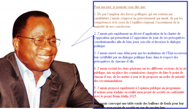 Monsieur Houngbédji, merci de bien vouloir vous prêter à cet exercice de la conjugaison au conditionnel de votre action politique. En supposant que vous n’ayez pas été volé de votre élection qu’est-ce que le président de la république que vous auriez été aurait fait que l’actuel président n’a pas fait ? Ou qu’est-ce qu’il n’aurait pas fait que l’actuel président a fait ou est en train de faire ? Certes il est plus facile d’énoncer ses intentions au conditionnel que de les conjuguer au présent mais au regard de la situation politique actuelle du Bénin, votre position nous intéresse Dix choses que le Président Adrien Hungbéji aurait Faites que Yayi n’a pas faites Eh bien cher Monsieur un simple observateur objectif ou bienveillant de la vie politique de notre pays aurait certainement énuméré les décision suivantes : 1. La construction du siège de l’Assemblée Nationale Et si vous aviez demandé à un sympathisant du PRD, peut-être qu’il vous aurait répondu que : a) Au titre des choses que je n’aurais pas fait et que M. Yayi a faites.