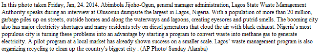 LAGOS, Nigeria – At Lagos’ largest dump, dozens of men gather to sort iron, plastic and nylon atop a 20-foot wall of garbage where hundreds of white herons compete to eat the spoils. Lagos is engulfed in waste. With a population of more than 20 million, the city has garbage that piles up on streets, outside homes and along the waterways and lagoons, creating eyesores and putrid smells. The booming city also has major electricity shortages and many residents rely on diesel generators that cloud the air with black exhaust. Lagos is turning these problems into an advantage by starting a program to convert waste into methane gas to generate electricity. A pilot program at a local market has already shown success on a small scale. Lagos’ waste management program is also organizing recycling to clean up the biggest city in Nigeria, Africa’s most populous country of about 170 million people. The project to harness waste to create power has begun at the 42-hectare (104 acre) Olusosun dump where pipes are stuck vertically into the ground to gather methane gas. « Those will eventually fire boilers that create electricity, » said Abimbola Jijoho-Ogun, general manager of administration for Lagos State Waste Management Authority as she pointed to the pipelines in about a quarter of the site. Olusosun receives about 40 per cent of the city’s estimated 10,000 metric tons of garbage per day, according to the waste management department. The project aims to produce enough electricity to light the waste management site, which is open through the night. « We aren’t reinventing the wheel, » said Jijoho-Ogun of Lagos’ initiatives, but the city is using this as an opportunity to take advantage of its high moisture waste. About 45 per cent of the garbage generated in the city is organic material. It might seem like a small solution to a huge problem, but the project is an important step in a plan that has come a long way in the years since Ola Oresanya was appointed chief executive of the waste management program. « It’s about changing the city, » said Oresanya. « You’re converting waste to energy, which is in demand, and over time it might also be viable as job creation. » Lagos is only among a handful of African cities looking at waste for energy, he said, unable to give an exact timeline for the estimated production of between 5 and 10 megahertz. Lagos’ waste management system is also building a recycling program and has organized the people already coming to the dump. Nearly 500 scavengers, now called « resource providers » by the city, collect what they can sell. « We go through the scraps and look for shoes, iron, plastic which we sort and sell it to companies, » said Samuel Jatel, 29, who said he provides for his wife and 3-year-old child. On the job for four years, he said he can make a maximum amount of 5,000 naira ($30) per day. Jude Michael, 41, said he makes about 1,000 naira a day. Nylon is made into refuse bags. Plastic bottles are collected and made into material for furniture. At the Ikosi market pilot scheme organic waste is turned into electricity. Fruit sellers bring their rotting fruit to the small shed, or it is collected by refuse workers. Then it is mashed up into a paste and fed into a 20 cubic meter red anaerobic digester where it ferments and emits gas to fill a balloon-like tank at the top. The waste is then taken from the bottom and used for gardening compost. The gas, filtered and then piped to a generator, produces a beam of light so that wholesale fruit sellers can unload their produce overnight. The exhaust from the generator is clear. Pineapples, bananas and watermelons seem to give the greatest outputs, said Tolulope Adeyo, recycling manager for the waste management program. She hopes the Ikosi market can provide its own electricity and that eventually the estimated 500 fruit markets in Lagos will power themselves. Adeyo said it’s also important to work with waste closer to the consumer. The city has advertised its recycling agenda on radio stations, encouraging residents to collect plastic and bring it in for cash or credits. In December 2013 they focused on households in selected neighbourhoods to sort their garbage, Adeyo said…. |