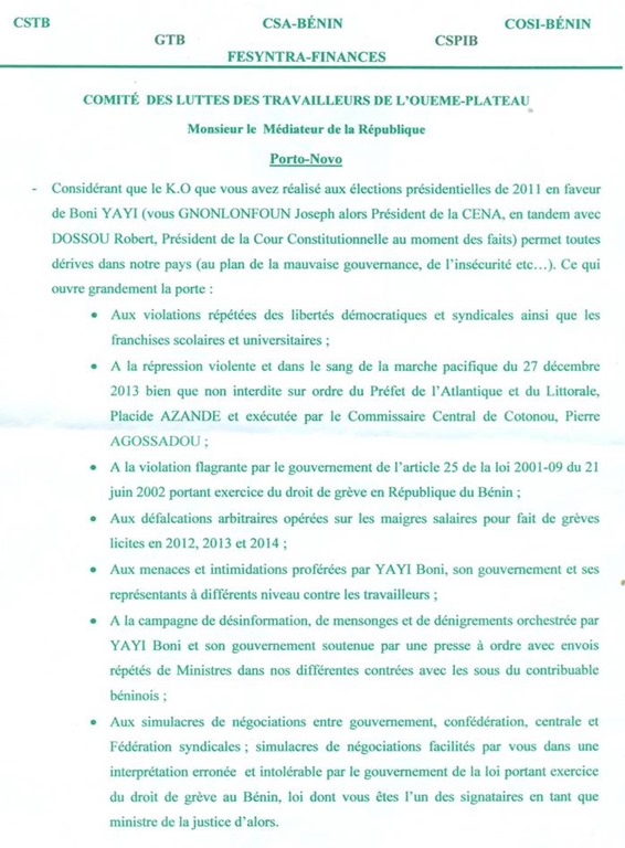 BENIN : SIT-IN CHEZ LE MEDIATEUR DE LA REPUBLIQUE