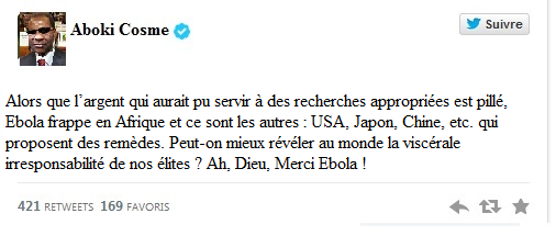 Alors que l’argent qui aurait pu servir à des recherches appropriées est pillé, Ebola frappe en Afrique et ce sont les autres : USA, Japon, Chine, etc. qui proposent des remèdes. Peut-on mieux révéler au monde la viscérale irresponsabilité de nos élites ? Ah, Dieu, Merci Ebola !