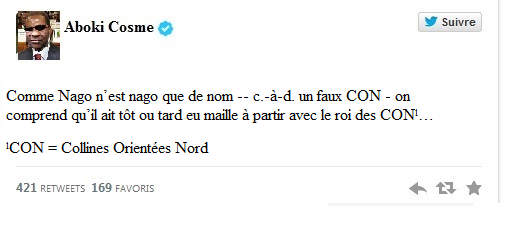 04/09/201404/09/2014 Binason Avèkes Tweet du Jour : Le Faux CON et le Roi des CON Comme Nago n’est nago que de nom — c.-à-d. un faux CON – on comprend qu’il ait tôt ou tard eu maille à partir avec le roi des CONˡ… ˡCON = Collines Orientées Nord Partager : Envoyer un lien par e-mail à un ami(ouvre dans une nouvelle fenêtre) E-mail Partager sur WhatsApp(ouvre dans une nouvelle fenêtre) WhatsApp Partager sur Telegram(ouvre dans une nouvelle fenêtre) Telegram Partager sur Tumblr Imprimer(ouvre dans une nouvelle fenêtre) Imprimer TweetPlus Partager sur Reddit(ouvre dans une nouvelle fenêtre) Reddit J’aime chargement… Similaire