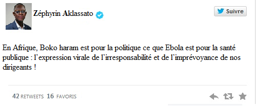 06/09/201406/09/2014 Binason Avèkes Le Tweet du Jour : Boko Haram, l’Ebola Politique En Afrique, Boko haram est pour la politique ce que Ebola est pour la santé publique : l’expression virale de l’irresponsabilité et de l’imprévoyance de nos dirigeants ! Partager : Cliquer pour envoyer un lien par e-mail à un ami(ouvre dans une nouvelle fenêtre) E-mail Cliquez pour partager sur WhatsApp(ouvre dans une nouvelle fenêtre) WhatsApp Cliquez pour partager sur Telegram(ouvre dans une nouvelle fenêtre) Telegram Partager sur Tumblr Cliquer pour imprimer(ouvre dans une nouvelle fenêtre) Imprimer TweetPlus Cliquez pour partager sur Reddit(ouvre dans une nouvelle fenêtre) Reddit J’aime chargement… Similaire