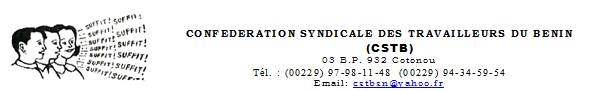 Point III : la sédentarisation des enseignants vacataires La question relative à la sédentarisation des enseignants vacataires a fait l’objet d’un long développement fait par le Ministre de l’Enseignement Secondaire Technique et Professionnel et de la Réinsertion des Jeunes, sur le fait que sans les enseignants vacataires les collèges ne peuvent tourner, car leur nombre avoisinerait 42.000. Mais le Ministre a manqué de demander ouvertement à la fonction publique de les recruter et de les mettre à sa disposition pour que l’Ecole soit sauvée. Son développement a été renchéri tour à tour par les Secrétaires Généraux qui ont demandé au gouvernement de régler définitivement cette question. Le SG/CSTB a particulièrement insisté sur la nécessité pour le Gouvernement de recruter comme APE tous les Enseignants Vacataires en prenant en compte le nombre d’années de service effectué compte tenu de l’expérience accumulée. Au terme des divers échanges, il a été retenu de mettre sur pied un Comité ad hoc chargé, d’une part, de procéder à un recensement exhaustif des enseignants vacataires et de soumettre à la Commission les résultats de ses travaux assortis de propositions, le Lundi 22 septembre 2014 à 16 heures à l’INFOSEC. Monsieur Paul Essè IKO a rappelé à l’assistance que pour aller vite il faut exploiter la liste des vacataires qui avait déjà été faite par une commission dirigée par le Ministre de l’Enseignement Secondaire. Le Comité ad hoc mis sur pieds est composé comme suit : 1- Le DRH du ministère en charge de l’Enseignement Secondaire ; 2- Le DRH du ministère en charge de la Fonction Publique ; 3- Le DEB/MEF ; 4- Représentants des Confédérations Syndicales : – Madame SOSSOUKPE Mathurine de la CSTB ; – Monsieur YEDEMEY Pierre-Paul de la COSI-BENIN. A cet effet la CSTB a proposé et soutenu que deux représentants des syndicats des vacataires soient membres du comité ad hoc mais curieusement Monsieur TODJINOU Pascal et les siens s’y sont farouchement opposés. Ils ont été soutenus dans cette position par le Ministre d’Etat et ainsi les concernés ont été arbitrairement écartés d’une commission ou leur présence était très utile pour la transparence des opérations et pour la pertinence des propositions à faire à la commission nationale. Pourquoi TODJINOU et les siens s’opposent-il à la représentation des vacataires au sein d’une commission qui doit traiter de leurs problèmes pour lesquels ils luttent depuis des années ? Rien ne l’explique si ce n’est que la poursuite de la traitrise. Point IV : la crise au sein du secteur de la santé La crise qui secoue le secteur de la santé a été abordée par les Secrétaires Généraux des Organisations Syndicales. La Ministre de la Santé a déclaré que la majorité des agents de santé ont déjà perçu sur leur fiche de paie les primes de risque mais qu’elle n’a pas la liste du reste qui n’a pas perçu. Elle a souhaité que la commission se penche sur les problèmes du paiement des arriérés de prime et de la revalorisation des indemnités de logement. Après cet exposé le gouvernement n’a pris aucun engagement à régler les problèmes des agents administratifs et paramédicaux en grève. Pendant le déroulement des discussions le SG/CSTB est revenu à plusieurs reprises sur la mauvaise organisation des réunions de négociation où sur les dix neuf (19) membres titulaires de la commission provenant des organisations syndicales (choisi selon les résultats des dernières élections professionnelles) seul les sept (07) secrétaires généraux ont droit à la parole alors que de l’autre côté tous les douze (12) membres représentants du gouvernement ont tous droit à la parole lors des discussions. On viole là encore les critères de représentativité des travailleurs. La CSTB est la plus lésée des confédérations syndicales puisque sur cinq (05) représentants titulaires qu’elle a dans la commission c’est un (01) seul qui a droit à la parole au même titre que ceux qui ont trois (03) ou deux (02) représentants. Cela est anti-démocratique. Conclusion Il ressort de ce compte rendu que le gouvernement, en convoquant cette rencontre, n’avait rien de sérieux à servir aux responsables syndicaux. Le Ministre d’Etat a tenté une manœuvre dilatoire en déclarant aux participants qu’en matière de salaire les enseignants sont au même niveau que tous les autres travailleurs et qu’il faut leur trouver quelque chose de spécial comme incitation à la fonction enseignante. Le Ministre tente de refuser ainsi aux enseignants le bénéfice du décret 2011-505, portant revalorisation des indices de traitement des Agents de l’Etat. Ce qui montre encore une fois la nature de la gouvernance du pouvoir actuel qui dirige le pays sur la base de la ruse, de la violation permanente des textes en vigueur et des principes élémentaires de la démocratie. Aujourd’hui, pour sauver l’école, il faut : – Recruter les vacataires déjà en poste comme APE, recruter suffisamment d’enseignants au primaire, secondaire et au supérieur. Pour sauver l’école le gouvernement doit s’engager immédiatement à commencer par payer les 1,25 aux enseignants. Pour sauver l’école le gouvernement doit faire reprendre les élèves qui ont été exclus de leur établissement pour avoir soutenu leurs enseignants grévistes. – Pour sauver la santé des citoyens, il faut régler les problèmes des travailleurs du secteur de la santé en grève. – Pour sauver la démocratie et sauver le pays, il faut respecter les textes relatifs à la représentativité des travailleurs et à d’autres principes démocratiques, s’engager à écouter sincèrement les travailleurs et les peuples et à régler leurs problèmes. C’est cet engagement que les travailleurs et le peuple béninois attendent du gouvernement du Président YAYI Boni à la renc
