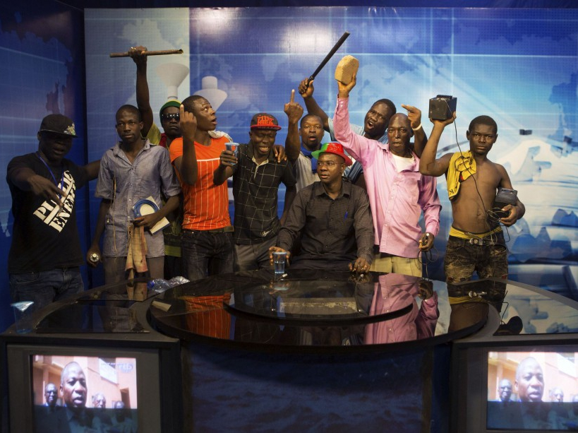Des manifestants sur un plateau de la télévision d’Etat à Ouagadougou, le 30 octobre. Situé à proximité du parlement, le bâtiment a lui aussi été saccagé. Le matériel, dont les caméras, a été pillé, et des voitures ont été cassées.