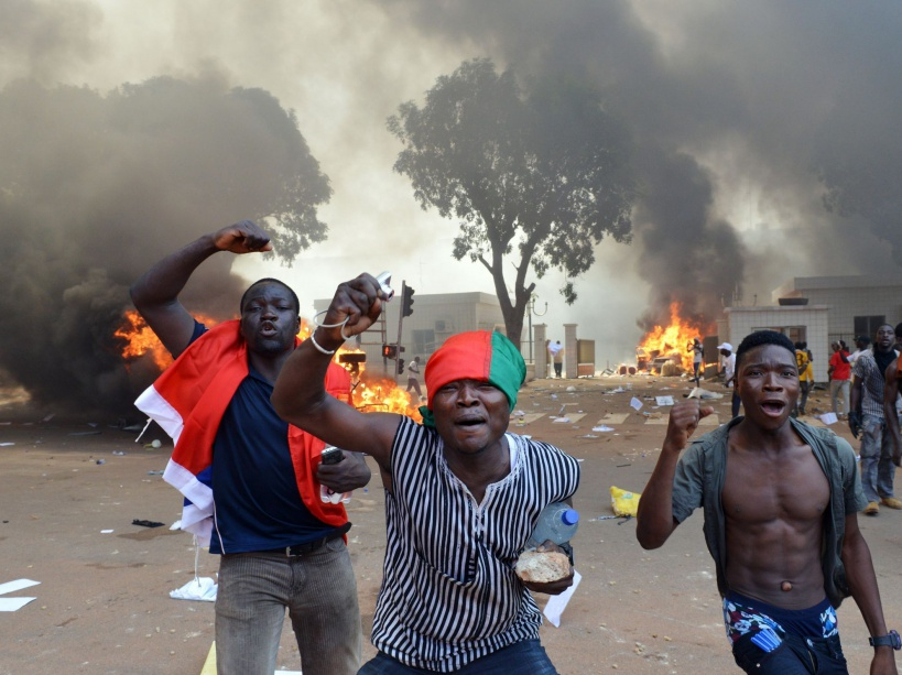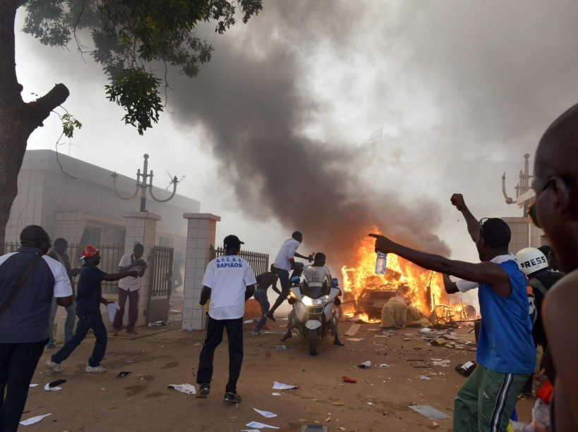Des hommes scandent des slogans devant des voitures en train de brûler près de l’Assemblée nationale, le 30 octobre, à Ouagadougou.