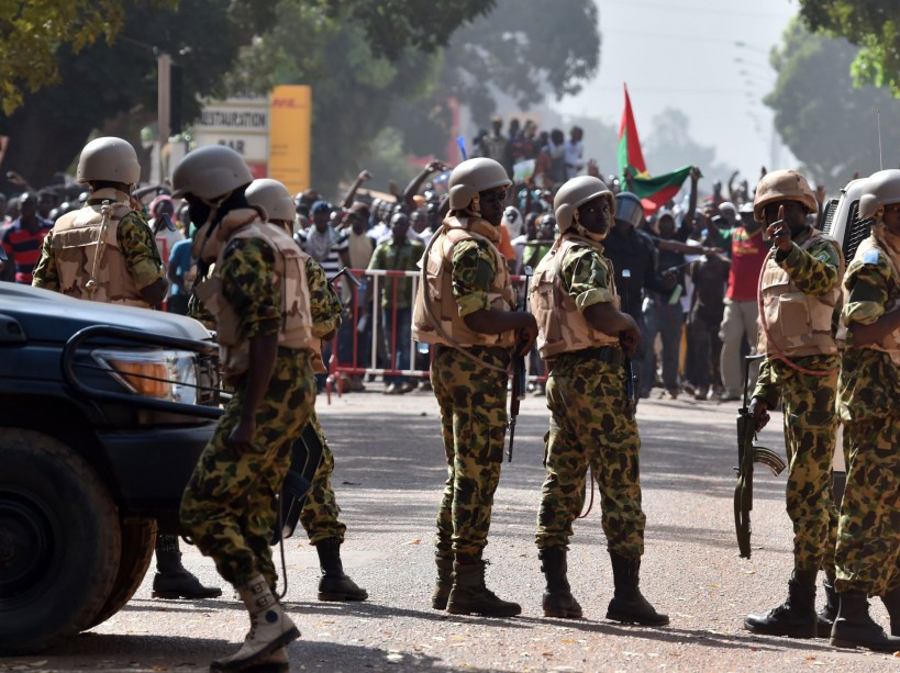 Des soldats face aux manifestants, le 30 octobre, à Ouagadougou.