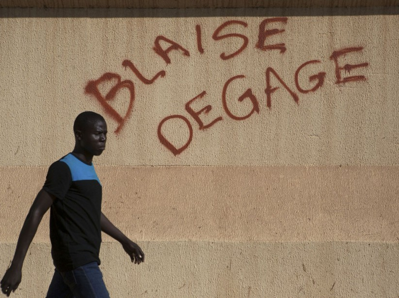Un homme marche le long d’un mur où un tag réclame le départ du président Compaoré, à Ouagadougou, le 29 octobre.
