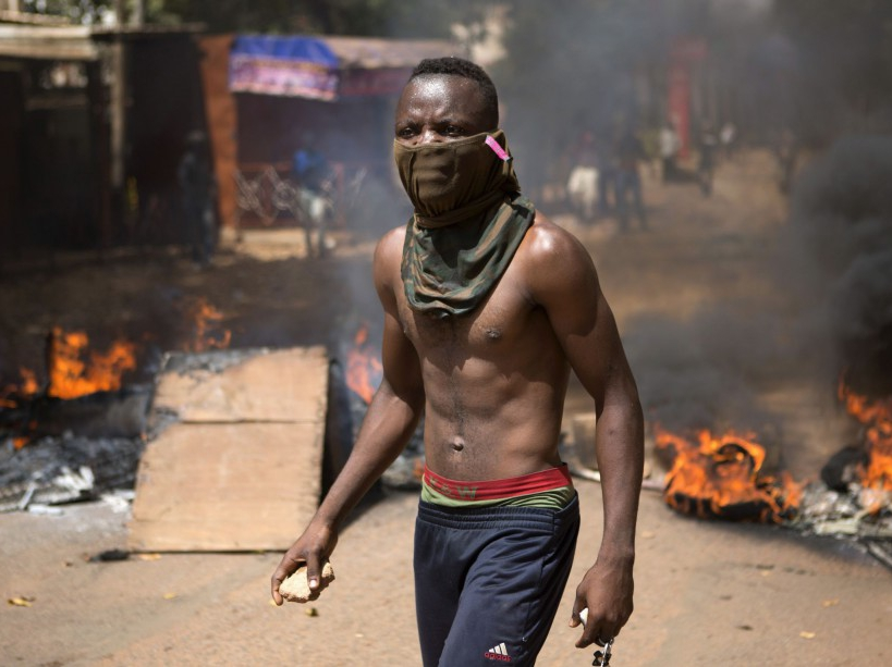 Un manifestant tient des pierres devant une barricade en feu, à Ouagadougou, le 28 octobre. La fronde ne se cantonne pas à la capitale : la mairie et le siège du parti présidentiel ont été incendiés à Bobo Dioulasso, la 2e ville du pays, a-t-on appris le 30 octobre.