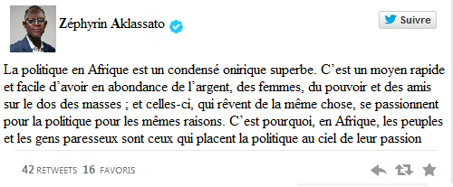 La politique en Afrique est un condensé onirique superbe. C’est un moyen rapide et facile d’avoir en abondance de l’argent, des femmes, du pouvoir et des amis sur le dos des masses ; et celles-ci, qui rêvent de la même chose, se passionnent pour la politique pour les mêmes raisons. C’est pourquoi, en Afrique, les peuples et les gens paresseux sont ceux qui placent la politique au ciel de leurs passions.
