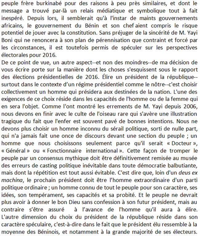 Messieurs, en conclusion de cette lettre qui vous est collectivement adressée, j’ose espérer que les considérations soulevées ici ainsi que la suggestion formulée d’une action concertée pour une intervention responsable dans la donne électorale de 2016, auront à vos yeux rang et valeur de mission. Et, dans l’espoir que vous ne trahiriez pas cette noble mission, je vous prie d’accepter Messieurs, mes salutations citoyennes et mes remerciements sincères.