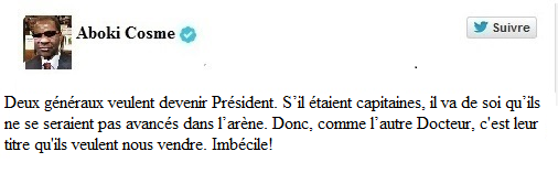 Deux généraux veulent devenir Président. S’il étaient capitaines, il va de soi qu’ils ne se seraient pas avancés dans l’arène. Donc, comme l’autre Docteur, c’est leur titre qu’ils veulent nous vendre. Imbécile!