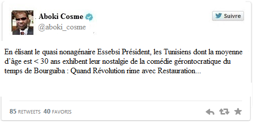 23/12/201423/12/2014 Binason Avèkes Le Tweet du Jour : La Tunisie et la Restauration En élisant le quasi nonagénaire Essebsi Président, les Tunisiens dont la moyenne d’âge est < 30 ans exhibent leur nostalgie de la comédie gérontocratique du temps de Bourguiba : Quand Révolution rime avec Restauration… Écoutez le Tweet Rec1223-130700 Partager : Envoyer un lien par e-mail à un ami(ouvre dans une nouvelle fenêtre) E-mail Partager sur WhatsApp(ouvre dans une nouvelle fenêtre) WhatsApp Partager sur Telegram(ouvre dans une nouvelle fenêtre) Telegram Partager sur Tumblr Imprimer(ouvre dans une nouvelle fenêtre) Imprimer TweetPlus Partager sur Reddit(ouvre dans une nouvelle fenêtre) Reddit J’aime chargement… Similaire