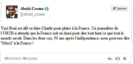 Yayi Boni est allé se faire Charlie pour plaire à la France. Un journaliste de l’ORTB a attendu que la France soit en émoi pour dire tout haut ce que tout le monde savait. Dans les deux cas, 50 ans après l’indépendance, nous pouvons dire « Merci » à la France ! |