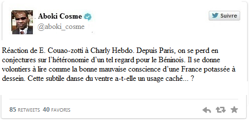 Réaction de F. Couao-zotti à Charly Hebdo. Depuis Paris, on se perd en conjectures sur l’hétéronomie d’un tel regard pour le Béninois. Il se donne volontiers à lire comme la bonne mauvaise conscience d’une France potassée à dessein. Cette subtile danse du ventre a-t-elle un usage caché… ? |