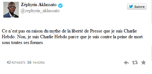 22/01/201522/01/2015 Binason Avèkes Le Tweet du Jour : Pourquoi Je Suis Charlie Hebdo Ce n’est pas en raison du mythe de la liberté de Presse que je suis Charlie Hebdo. Non, je suis Charlie Hebdo parce que je suis contre la peine de mort sous toutes ses formes Partager : Cliquer pour envoyer un lien par e-mail à un ami(ouvre dans une nouvelle fenêtre) E-mail Cliquez pour partager sur WhatsApp(ouvre dans une nouvelle fenêtre) WhatsApp Cliquez pour partager sur Telegram(ouvre dans une nouvelle fenêtre) Telegram Partager sur Tumblr Cliquer pour imprimer(ouvre dans une nouvelle fenêtre) Imprimer TweetPlus Cliquez pour partager sur Reddit(ouvre dans une nouvelle fenêtre) Reddit J’aime chargement… Similaire