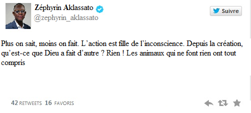 25/01/201525/01/2015 Binason Avèkes Le Tweet du Jour : Dieu, l’Animal et l’Homme dans cet ordre Plus on sait, moins on fait. L’action est fille de l’inconscience. Depuis la création, qu’est-ce que Dieu a fait d’autre ? Rien ! Les animaux qui ne font rien ont tout compris Partager : Cliquer pour envoyer un lien par e-mail à un ami(ouvre dans une nouvelle fenêtre) E-mail Cliquez pour partager sur WhatsApp(ouvre dans une nouvelle fenêtre) WhatsApp Cliquez pour partager sur Telegram(ouvre dans une nouvelle fenêtre) Telegram Partager sur Tumblr Cliquer pour imprimer(ouvre dans une nouvelle fenêtre) Imprimer TweetPlus Cliquez pour partager sur Reddit(ouvre dans une nouvelle fenêtre) Reddit J’aime chargement… Similaire