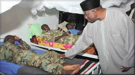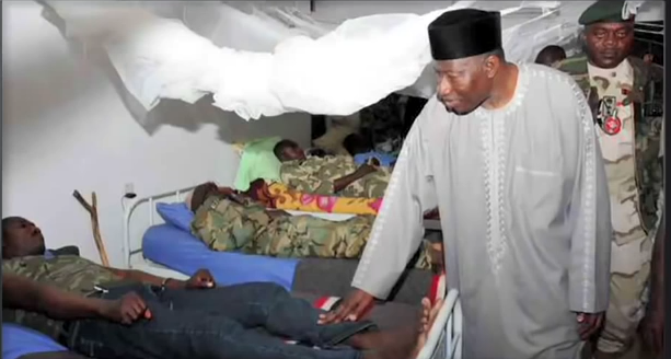 Depuis des années que le groupe Boko Haram sévit dans l l’État de Borno et au-delà, le président Jonathan n’a concédé à se rendre dans sa capitale Maiduguri pour la première fois que récemment et ce dans le cadre très égoïste de sa campagne électorale : doit en rire ou en pleurer ? Et ce n’est pas tout. Observez ici ce qui est présenté comme une visite d’un hôpital de soldats blessés. Le côté aseptisé, propret, et apprêté du cadre laisse sceptique quant à la vérité de la scène : mur propre, pas d’installation ou d’objet médical, des moustiquaires d’une propreté immaculée… L’Etat Théâtre en pleine action… Par comparaison, regardez l’ambiance lors de visites similaires par des pairs de Jonathan : Obama visite un blessé de guerre dans son pays