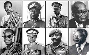 Le 6 Mars 1957, première colonie britannique en Afrique à ce titre, le Ghana accède à l’indépendance, avec Osagyefo Dr Kwame Nkrumah comme premier Premier ministre. Le 1er Juillet, 1960, il est devenu une république avec Kwame Nkrumah comme président. Le 24 Février 1966, le gouvernement du Dr Nkrumah fut renversé par une junte des Forces armées et de la Police du Ghana. Un Conseil national de libération (NLC), dirigé par le lieutenant général Joseph Arthur Ankrah, a été formé pour administrer le pays. Le général Ankrah a été démis de ses fonctions en Avril 1969 et le lieutenant-général Akwasi Amankwa Afrifa est devenu le président du NLC, qui plus tard a fait place à une conseil présidentiel de trois hommes présidé par le général Afrifa. La conseil présidentiel a ouvert la voie à une élection générale en 1969 qui a amené au pouvoir le gouvernement du Parti du progrès, avec le Dr Kofi Busia Abrefa en tant que Premier ministre et M. Edward Akufo-Addo en tant que président. Les Forces armées du Ghana à nouveau sont intervenues dans la politique nationale, le 13 Janvier 1972, et le colonel (plus tard général) Ignace Kutu Acheampong est devenu chef de l’Etat et président du Conseil national de la Rédemption (CNRC). Le nom du CNRC a été changé plus tard en Conseil militaire suprême (SMC) mais le général Acheampong a été remplacé par le général FWK Akuffo dans une révolution de palais en Juillet 1978. Le SMC a été renversé le 4 Juin 1979 suite à une révolte de masse des officiers subalternes de l’Armée et des hommes du rang. Après le soulèvement, un Conseil révolutionnaire des forces armées (AFRC) a été mis en place sous la présidence de Lt. d’aviation Jerry John Rawlings. Le 24 Septembre 1979, l’AFRC a remis le pouvoir à l’administration civile du Dr Hilla Limann, chef du Parti national populaire (PNP), qui avait remporté les élections.