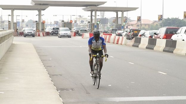 | Un cycliste courageux s’aventure sur la route dans la ville alors que les conduites dangereuses et les braquages sont les causes d’accidents. Nous sommes au péage sur le pont Lekki-Ikoyi, ouvert en 2013 …