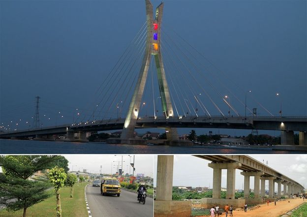 | Trois ponts relient le continent à l’île de Lagos, au cœur de la ville. Le bidonville de la lagune de Makoko est visible du troisième pont continental. Au cours des dernières années, certains bidonvilles ont été démolis