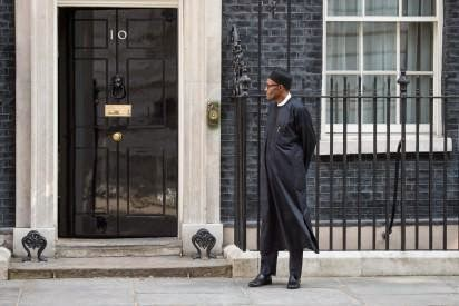 Buhari s’affiche ostensiblement devant le 10 Downing Street, l’air de dire “j’y ai été, j’en suis” |