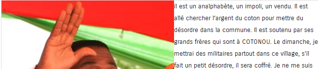 il est un analphabète, un impoli, un vendu. Il est allé chercher l’argent du coton pour mettre du désordre dans la commune. Il est soutenu par ses grands frères qui sont à COTONOU. Le dimanche, je mettrai des militaires partout dans ce village, s’il fait un petit désordre, il sera coffré. Je ne me suis pas fâché, je mettrai tout en œuvre pour faire toutes les routes de Manigri. Ne votez pas pour lui, ne votez pas pour ABT, votez Cauris… Des militaires dans ce village pour tout moindre désordre. Je ferais toutes les routes de Manigri, je vous donnerai de l’eau, de l’électricité. Dans quel pays avez-vous vu ça ? Moi, Chef de l’Etat, je fais meeting et quelqu’un ose faire une caravane… Dixit Yayi Boni Président du Bénin.