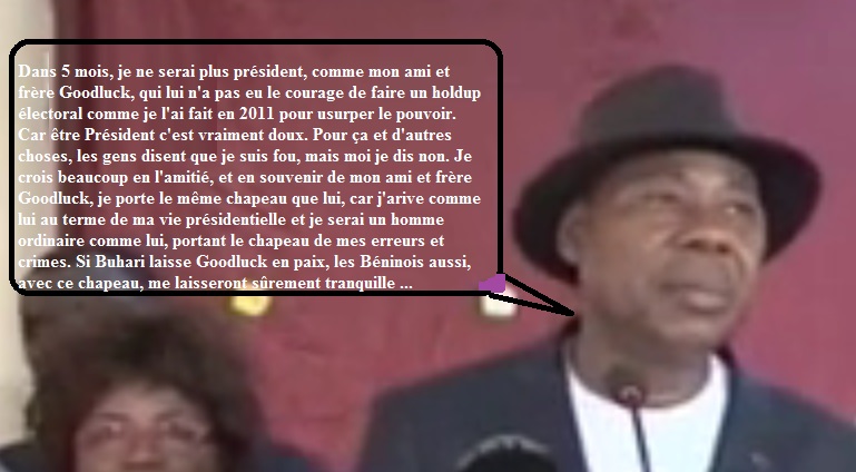 « Dans 5 mois, je ne serai plus président, comme mon ami et frère Goodluck, qui lui n’a pas eu le courage de faire un holdup électoral, comme je l’ai fait en 2011 pour usurper le pouvoir. Car être président, c’est vraiment doux. Pour ça et d’autres raisons, les gens disent que je suis fou mais moi je dis non. Je crois beaucoup à l’amitié, et, en souvenir de mon ami et frère Goodluck, je porte le même chapeau que lui, car j’arrive comme lui au terme de ma vie présidentielle, et je serai un homme ordinaire comme lui, portant le chapeau de mes erreurs et crimes. Si Buhari laisse Goodluck en paix, les Béninois aussi, avec ce chapeau, me laisseront sûrement en paix. »