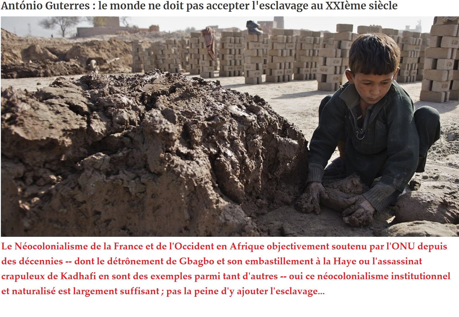 Le Néocolonialisme de l’Occident en Afrique objectivement soutenu par l’ONU depuis des décennies — dont le détrônement de Gbagbo et son embastillement à la Haye ou l’assassinat crapuleux de Kadhafi en sont quelques exemples parmi tant d’autres — oui, Monsieur Guterres, ce néocolonialisme institutionnel et naturalisé est largement suffisant ; pas la peine d’y ajouter l’esclavage… !