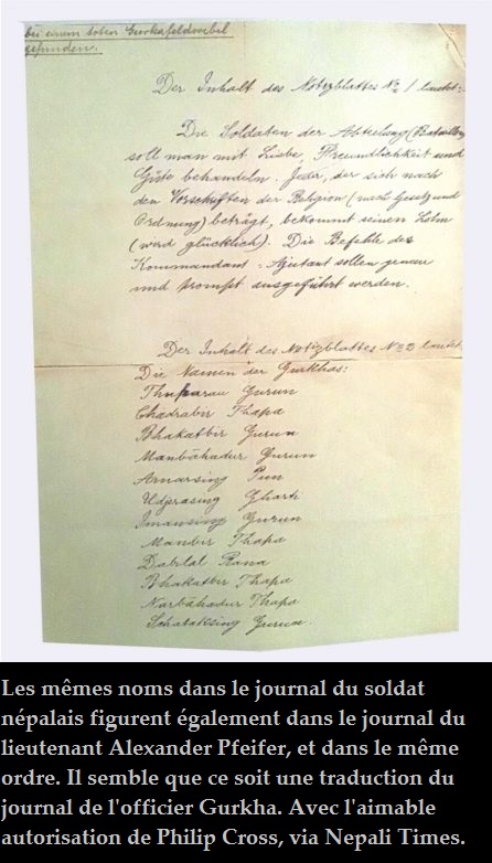 La deuxième page du journal du soldat népalais (ci-dessus) porte les noms des Gurkhas qui, fait intéressant, sont les mêmes noms trouvés dans le même ordre dans les papiers du Lt Pfeifer dans lesquels il énumère les noms des Gurkhas qui ont été faits prisonniers (à gauche) . La phonétique allemande ressemble également étroitement à la façon dont le soldat inconnu a écrit les noms en népalais, par exemple, en épelant Gurung comme गुरुं (Gurun).