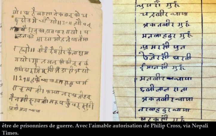 Le journal du soldat népalais, écrit à la main il y a 107 ans, en dit long sur la guerre et les guerriers du Népal. Le soldat écrivait au sujet de ses camarades Népalais dans ses propres unités, et peut-être d’autres unités, énumérant soigneusement les noms des morts et des prisonniers. Les noms dans le poème sont probablement ceux qui ont été tués au combat, mais nous ne pouvons pas en être sûrs. L’autre liste, en raison de sa similitude avec la liste du Lt Pfeifer en allemand, pourrait être celle de ceux qui ont été faits prisonniers le 20 décembre.