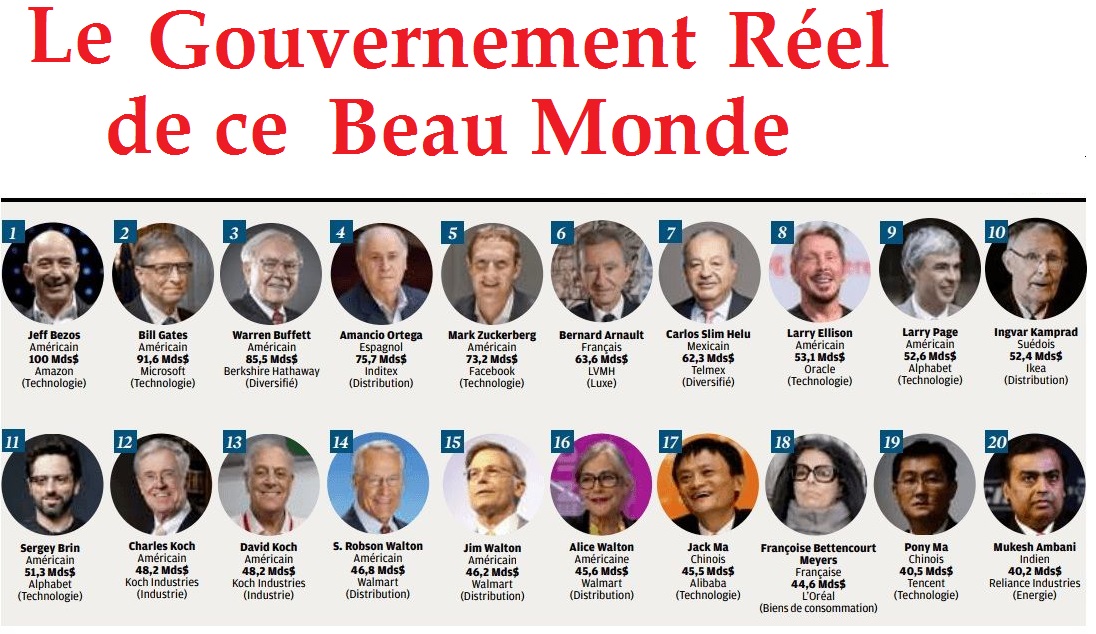 On ne peut comprendre et rendre raison aux énormes absurdités qui marquent les événements du monde, et que révèlent la pandémie du Covid, sans comprendre la gouvernance du monde dans sa présentation théâtrale. Celle-ci est organisée sur le mode dual de l’apparence et de la réalité. Dans ce qui se donne à voir dans la vie de nos nations respectives, il y a l’apparence des chefs d’État ou d’institution : les Biden, Suga, Guterres, Tedros, Johnson, Trudeau et autres Merkel ou Macron. Mais ceux-là ne sont que des pantins à la solde des gouvernants réels, ceux qui, à coup de soudoiements et de financements de tout ce qui bouge — politiques, média, journalistes, médiateurs culturels, etc..- les ont placés à leurs postes et leur donnent les ordres qu’ils sont obligés d’exécuter en bonne intelligence…