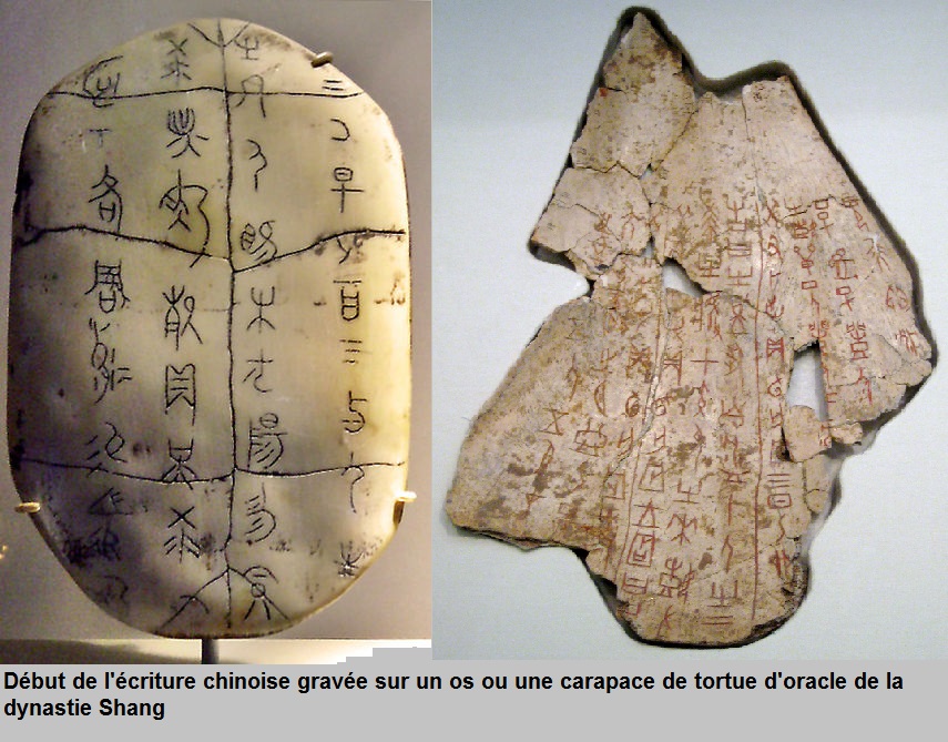 C’est de ces inscriptions sur os de bovidés ou carapaces de tortue que naquirent les caractères chinois vers 1200 avant l’ère chrétienne sous le règne du roi Wu Ding de la dynastie pré-impériale des Shang.