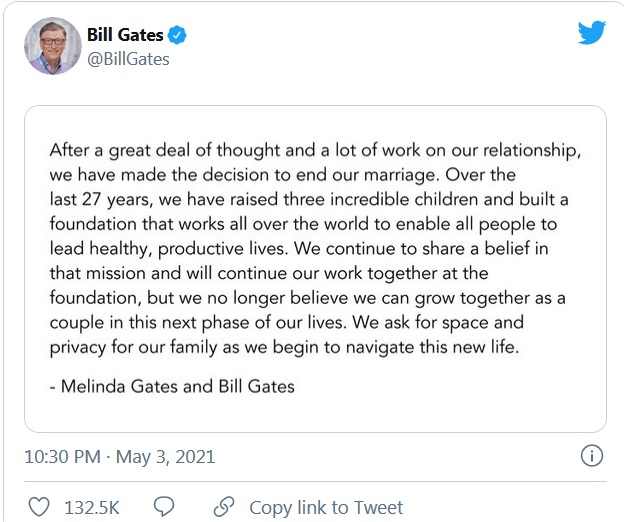 Le couple a publié une déclaration conjointe officielle à cet effet et celle-ci a été publiée sur le compte Twitter officiel de Gates lundi soir.