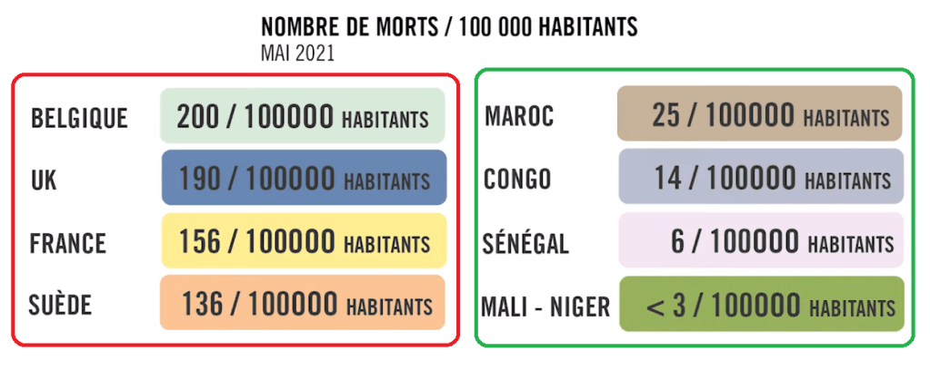 Un exemple frappant. La France seule a presqu’autant de morts par Covid que toute l’Afrique réunie. Et encore, c’est parce que misère oblige, le phénomène d’achat de morts qui curieusement caractérise cette pandémie a fonctionné à plein régime en Afrique. Plus on déclarait de cas, et plus encore, plus on déclarait de morts par Covid plus on était payé… par le système. Rappelons qu’aux USA, un mort par Covid rapportait pas moins de 4000 dollars à l’hôpital qui l’a déclaré… Si on exclut ce phénomène qui y a sévi très fort, les morts par Covid en Afrique, c’est peanuts !