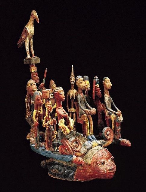 Photo de RasMarley sur flickr · · · Nigéria Yoruba Masque casque Magbo pour l’association Oro Artiste Onabanjo d’Itu Meko Date de création 1880-1920 Matériaux: bois, pigment, fer H: 28 3/4 x 13 3/4 x 18 1/2 in. L’association Oro est chargée de l’application des amendes et des peines et des sanctions. L’Oro utilise des masques de ce type lors des fêtes annuelles. Les masques sont également impliqués dans les procédures d’inhumation pour tous, quel que soit le statut du défunt. Les nombreuses figures sur le dessus du masque, y compris un prisonnier, un prédicateur, un musicien et un soldat indiquent que les activités d’Oro impliquent toute la communauté.Cette sculpture comprend plusieurs éléments qui ont été ramenés dans la région par d’anciens esclaves du Brésil. Ceux-ci incluent la forme à double volute juste au-dessus de la face principale, la grappe florale à l’arrière et ce qui semble être une guirlande de feuilles placée autour de la tête principale. Ces éléments brésiliens sont devenus courants dans l’architecture et d’autres formes d’art après avoir été introduits dans la seconde moitié du XIXe siècle. Bien que les attributions soient rares pour une grande partie de l’art africain, les chercheurs pensent que ce masque est l’œuvre du maître sculpteur Onabanjo de la ville d’Itu Meko.