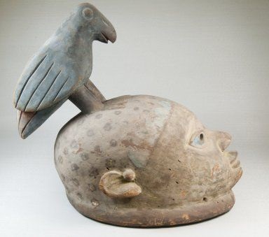 Agbigbo, the big-headed gray hornbill is a popular motif on Gelede headdresses because of its association with evil. According to the Ifa