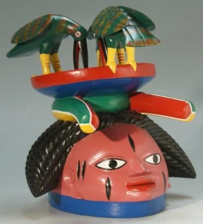 Yoruba gelede mask with 3 pigeons (mother and children)
