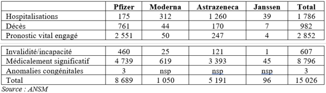 Concernant le vaccin de Pfizer, plus de 42,5 millions de doses avaient été administrées au 1er juillet 2021 (dont 700 000 à des jeunes de 16 à 18 ans) et 31 389 cas effets/évènements indésirables déclarés, principalement par les professionnels de santé. Parmi eux, 8 689 événements « graves » survenus à partir de l’âge de 30 ans (27,7% du total des événements indésirables), dont 2 551 mises en jeu du pronostic vital, 460 invalidités ou incapacités et 761 décès.