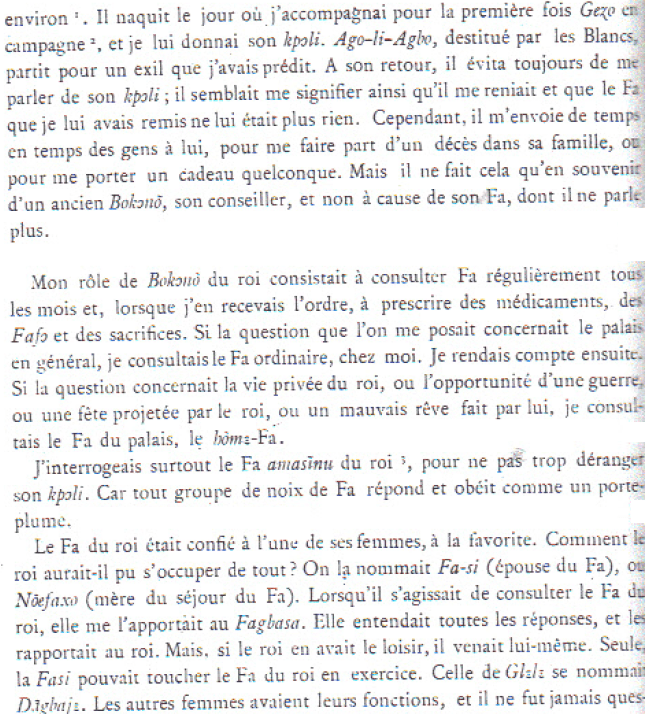 C’est à Glèlè que je dois le nom de Gɛdɛgbé, qui est celui d’un de ses talisman². C’est parce que ce talisman « est sur ma tête » que je me nomme ainsi. Ce talisman du palais, ce bo de honmè, que le roi me donna à boire avait un double but : affermir la confiance du roi en moi, et me faire vivre longtemps. Personne d’autre que moi ne porte ce nom au Danxomè, même dans la famille royale.