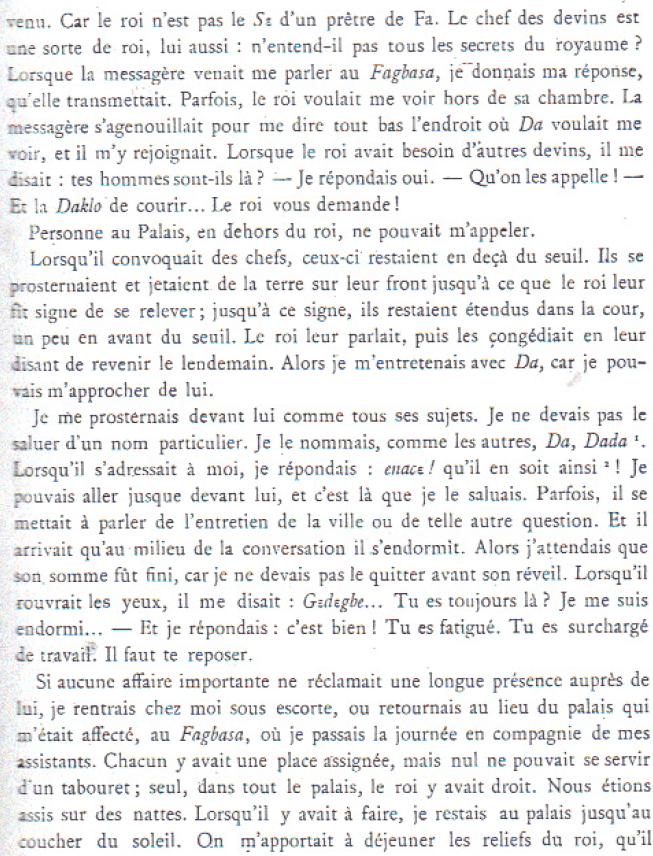 Laissant derrière moi le portail, je pénétrais dans la grande cour déserte de Logodomè, au bout de laquelle la porte Logodohon ouvrait sur une autre cour ; là s’élevait l’Ajarala, , où le roi appelait ceux qui avaient audience, notamment les ministres et les chefs. J’étais une des très rares personnes qui pussent faire le tour derrière l’Ajarala, et pénétrer dans l’adorxo, la chambre même du roi. Personne n’y entrait, sinon le grand Bokɔnon, le chef des kpamègan, et certaines femmes..