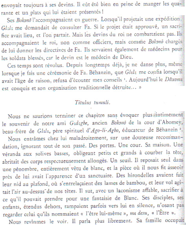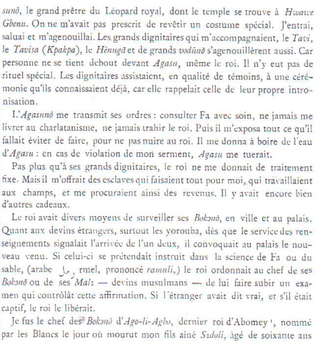 C’est à Glèlè que je dois le nom de Gɛdɛgbé, qui est celui d’un de ses talisman². C’est parce que ce talisman « est sur ma tête » que je me nomme ainsi. Ce talisman du palais, ce bo de honmè, que le roi me donna à boire avait un double but : affermir la confiance du roi en moi, et me faire vivre longtemps. Personne d’autre que moi ne porte ce nom au Danxomè, même dans la famille royale.