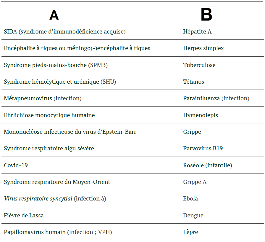 Dans la catégorie A, trois maladies sont désignées comme une infection, où ce dernier mot est sous-entendu et mis entre parenthèses. Ce sont le Métapneumovirus, le virus respiratoire syncytial et le papillomavirus humain. Dans ces trois cas, la désignation du virus se substitue par métonymie à celle de la maladie.