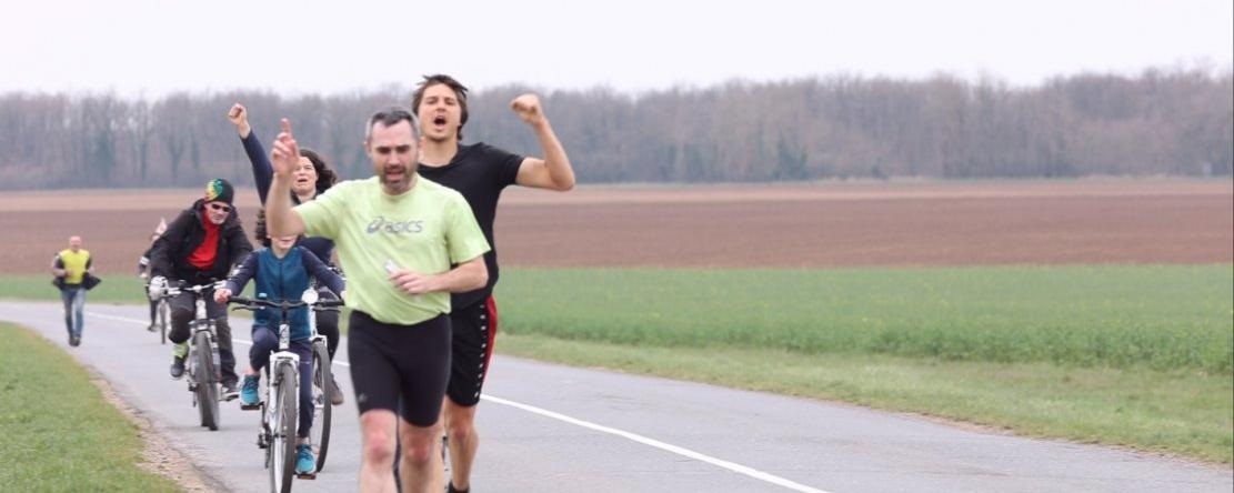 Les coureurs et cyclistes s’élancent à 10 h depuis Corquilleroy. Pour ce vingt-sixième jour de course, ils comptent rallier Grez-sur-Loing, petite commune de 1 500 habitants. Musique et chant accompagnent leurs foulées : ils vont courir entre trois heures et trois heures trente aujourd’hui, avec pour seule pause un ravitaillement d’une quinzaine de minutes. Raphaël Llodra démarre à jeun.