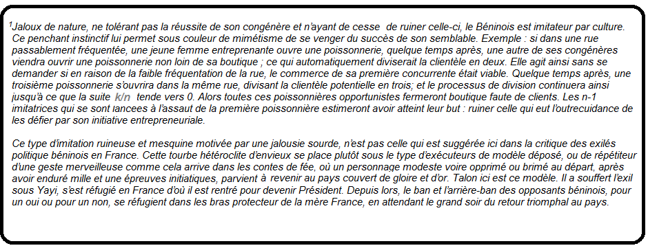 Le fait que la France soit ou continue d’être une démocratie est un sujet qui fait débat en France même. Mais si le Bénin était une démocratie digne de ce nom, le Chef de l’Etat, le gouvernement ne peut pas rester dans son coin et décider seul de l’installation de troupes françaises dans notre pays, dans le pays de Béhanzin, de Bio Guerra, de Kaba, de Kpoyinzoun et de bien d’autres héros de l’indépendance nationale, sans en référer au peuple et à ses représentants dans leur diversité et leur totalité. Au lieu de quoi, le gouvernement agit à huis clos et de manière autoritaire, pendant qu’une fois encore les Blancs se conduisent comme maîtres de ce pays que nos ancêtres ont défendu au prix de leur sang. Dans le même temps, si Talon n’obéissait pas à la volonté de la France, la tourbe suspecte de ses opposants, imitateurs nés₁ serait instrumentalisée contre lui et son régime ; celui-ci serait décrié comme dictatorial, et ses opposants exilés seraient mis en scène à longueur de temps dans les média français pour dire tout le bien qu’ils pensent de Barkhane et de l’œuvre française au Sahel. En somme, si le Bénin était une nation, les soi-disant opposants sauraient jusqu’où ne pas aller trop loin dans la mise en balance voire en danger de l’unité nationale. Et si le Bénin était une démocratie, ce serait au peuple béninois de décider si Barkhane, chassée du Mali, devrait trouver un point de chute au Bénin. Quelque part donc la paradoxale complicité ou soumission de Talon à la volonté française ne serait qu’une réaction préventive à la bêtise congénitale de notre race !