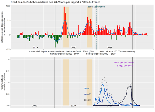 On observe le même phénomène chez les 60-69 ans. La surmortalité d’octobre 2020 est de plus en plus visible. On note qu’on arrive aux âges où la vaccination antigrippale devient gratuite pour tous. La surmortalité au moment de la 3e dose se démarque aussi.