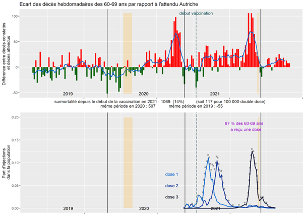 Pour les 60-69 ans en Autriche on observe des corrélations parfaites également, avec un record de surmortalité au moment de la 3e dose de vaccin anti-covid.