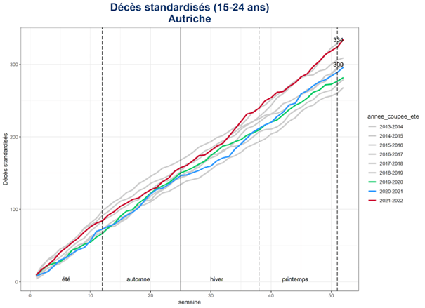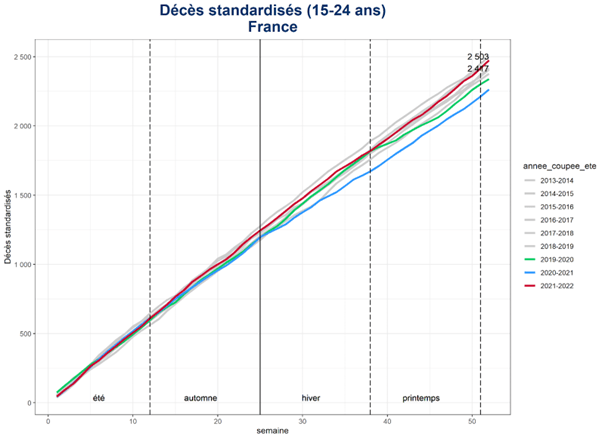 Pour les 15-24 ans en France, la mortalité standardisée ne cesse de baisser d’année en année. Pour la première fois entre juillet 2021 et juin 2022, la mortalité standardisée est remontée d’un coup. Elle n’est pas passé au-dessus du maximum observé, mais l’écart est vraiment visible.